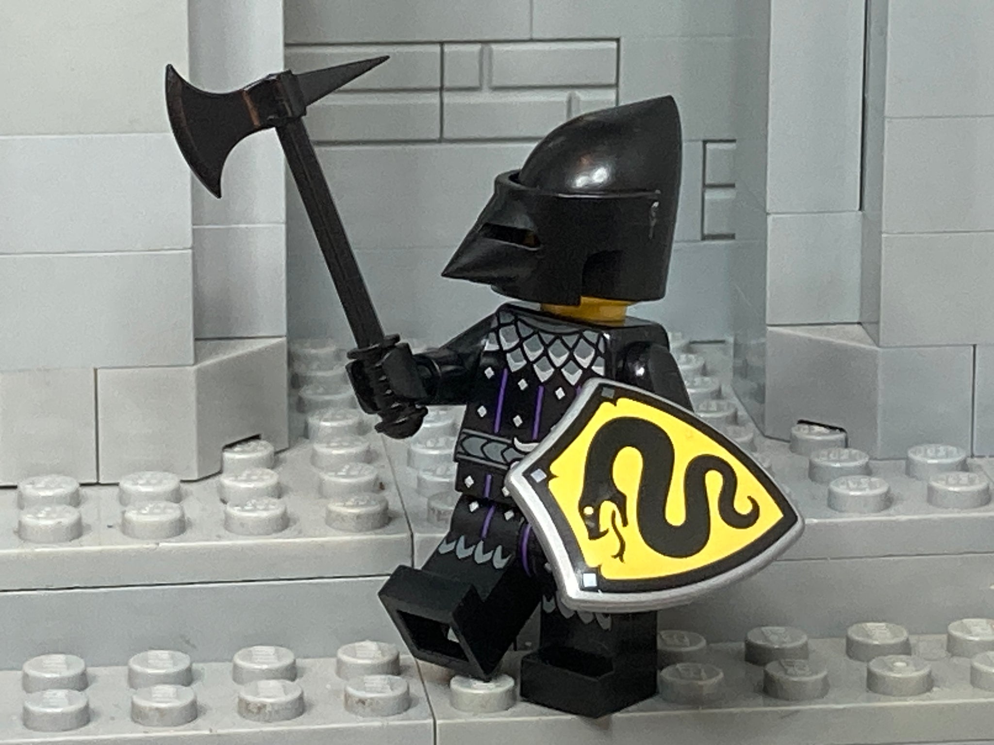 For Hire: a custom Black Knight in looking to fight for his Lord and defend his lands...This one comes with a Little Brick Armory Bascinet and Axe + Official LEGO MINIFIG parts